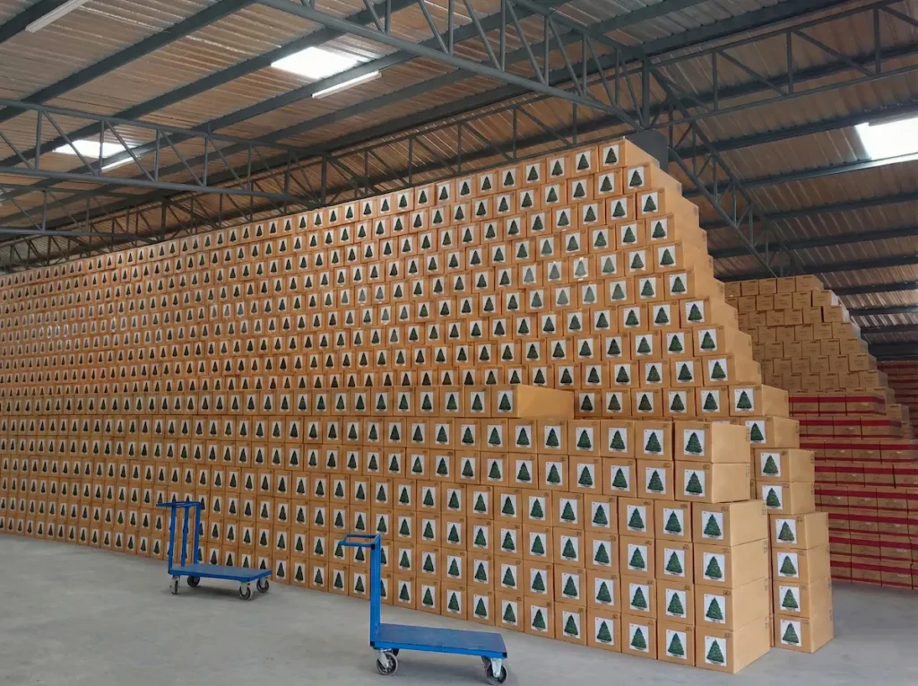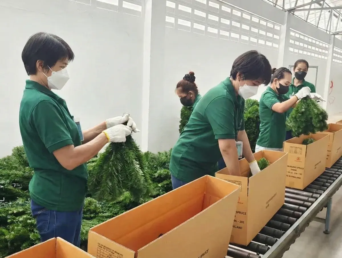 Our 20,000 SQM facility features more than just assembly. We operate our own metal workshop for sturdy bases and foliage production lines for realistic needles. Whether checking our robot welders or our massive warehouse inventory, you will find a professional team passionate about delivering the best.